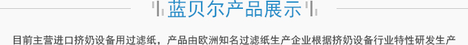 濟南藍貝爾工貿(mào)有限公司主要產(chǎn)品擠奶設(shè)備過濾紙,牛奶過濾紙,擠奶機過濾袋,目前主營進口擠奶設(shè)備用過濾紙,產(chǎn)品由歐洲知名過濾紙生產(chǎn)企業(yè)根據(jù)擠奶設(shè)備行業(yè)特性研發(fā)生產(chǎn),產(chǎn)品符合歐盟食品接觸標(biāo)準(zhǔn)及FDA食品接觸標(biāo)準(zhǔn),產(chǎn)品在擠奶設(shè)備過濾紙行業(yè)占有70%以上的份額。并通過了SGS標(biāo)準(zhǔn)技術(shù)檢測中心按國標(biāo)食品級標(biāo)準(zhǔn)進行的檢測。產(chǎn)品適用于各種擠奶設(shè)備品牌,本公司目前獲得該區(qū)域產(chǎn)品營銷資格。產(chǎn)品已用于國內(nèi)各大乳企所屬牧...